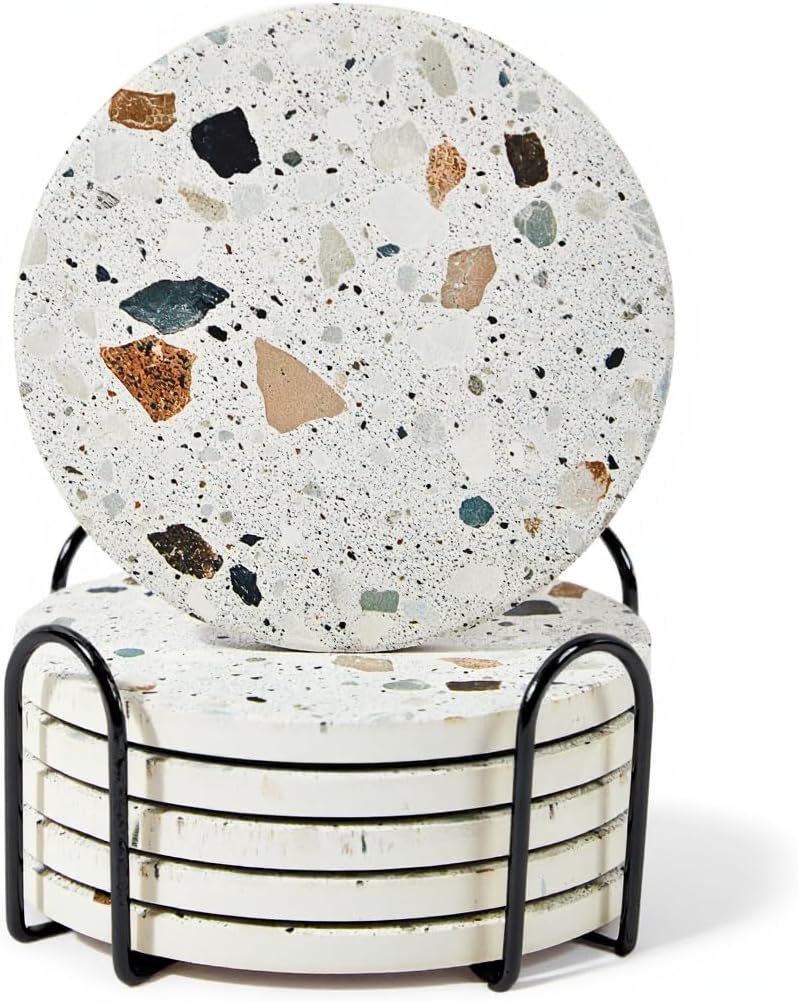 - Modern Terrazzo Style with Holder - Each drink coasters set of 6 includes a black metal coaster holder for neat storage when not in use. The terrazzo finish blends seamlessly with farmhouse, modern, or minimalist themes, making it suitable for desks, dining tables, or living room coffee table decor.