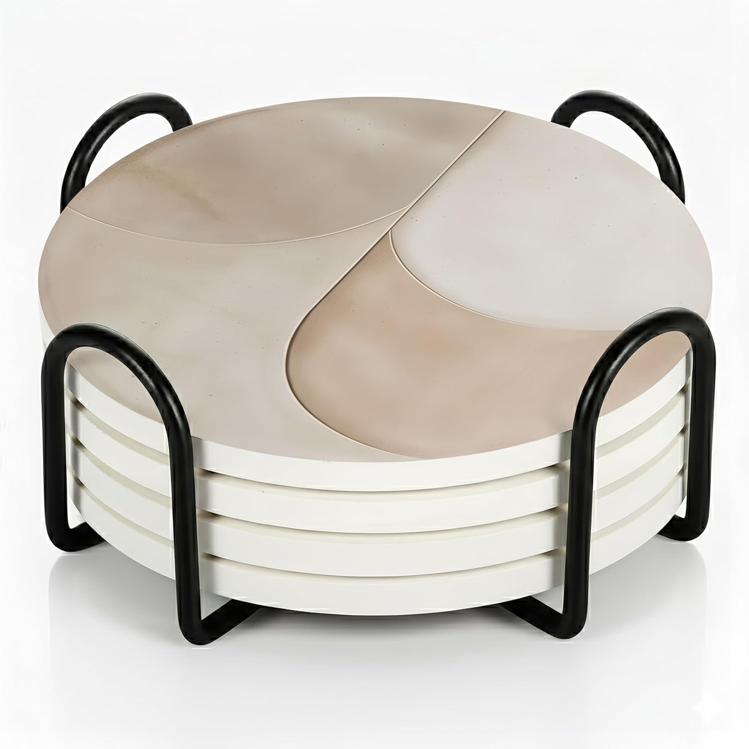- INSIDE EVERY VEYRO SET: Each set includes 6 ceramic coasters (4" diameter, 0.28" thick) with a matte printed finish and soft cork backing that prevents slipping while creating a subtle floating effect, plus a sturdy black metal holder in smooth matte finish, all packed in a gift-ready box. The size was chosen with intention — wide enough for tumblers, mugs, wine glasses, or cocktails, yet balanced for smaller cups, candles, or planters. Each coaster carries a satisfying weight that feels premium in hand, combining elegance with everyday function to create a versatile piece that protects and decorates beautifully.