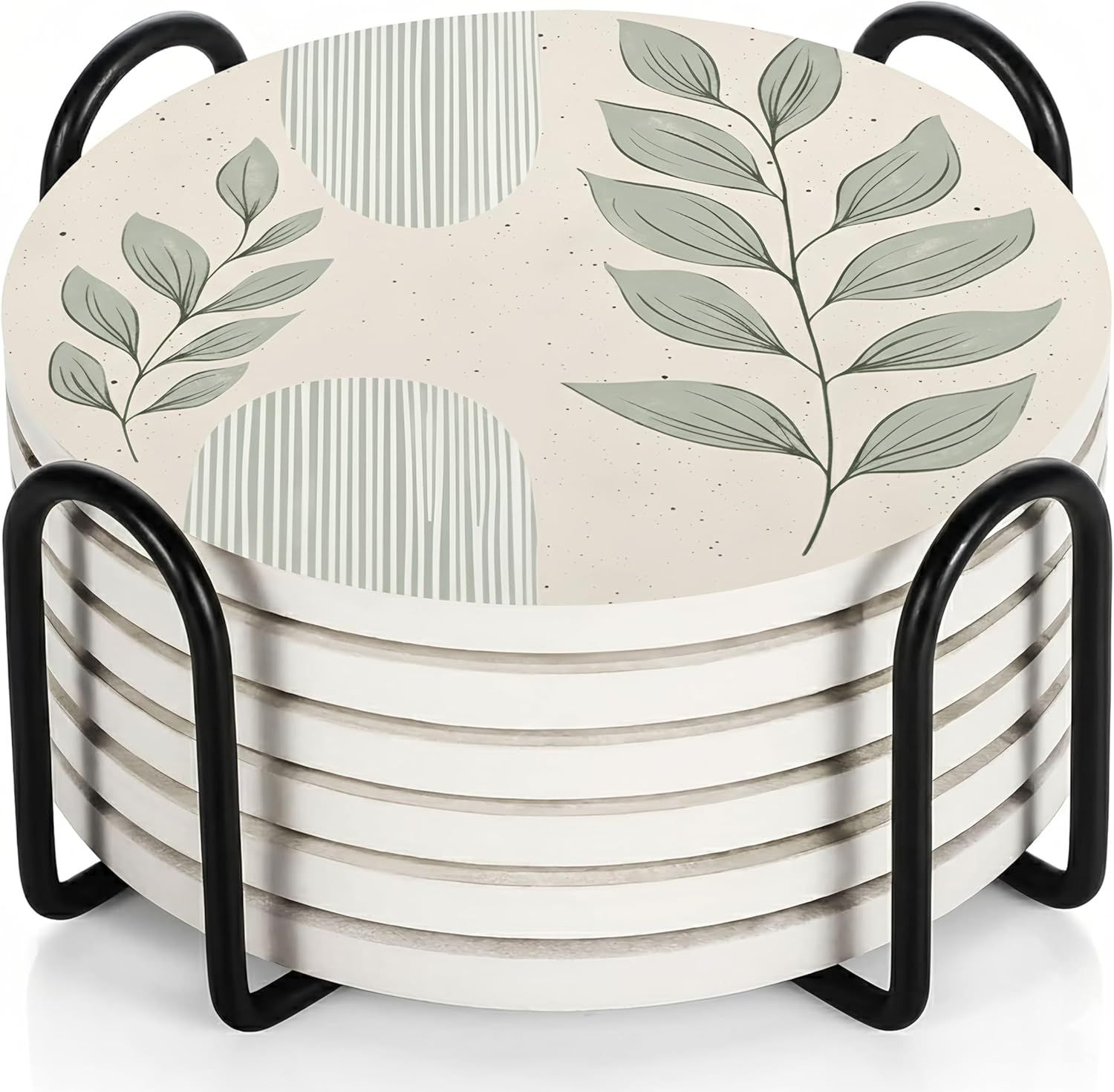 - INSIDE EVERY VEYRO SET: Each set includes 6 ceramic coasters (4" diameter, 0.28" thick) with a matte printed finish and soft cork backing that prevents slipping while creating a subtle floating effect, plus a sturdy black metal holder in smooth matte finish, all packed in a gift-ready box. The size was chosen with intention — wide enough for tumblers, mugs, wine glasses, or cocktails, yet balanced for smaller cups, candles, or planters. Each coaster carries a satisfying weight that feels premium in hand, combining elegance with everyday function to create a versatile piece that protects and decorates beautifully.