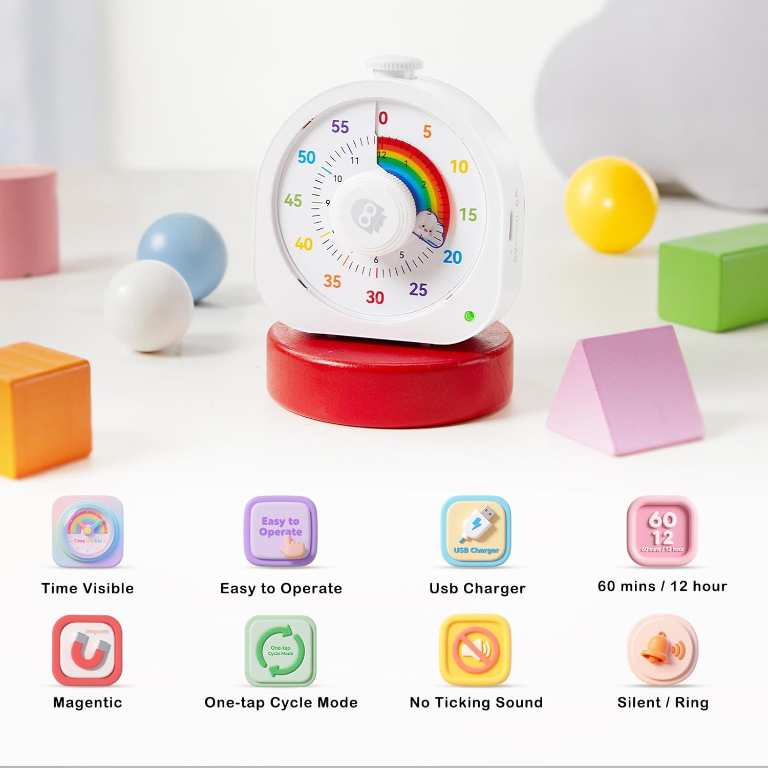 - 🕒 Rainbow Visual Timer for Kids & Adults – Rainbow pattern design stimulates children's interestand. Watch time pass with vibrant rainbow segments! Easy-to-read countdown (60min or 12h) helps kids and ADHD users manage tasks visually.