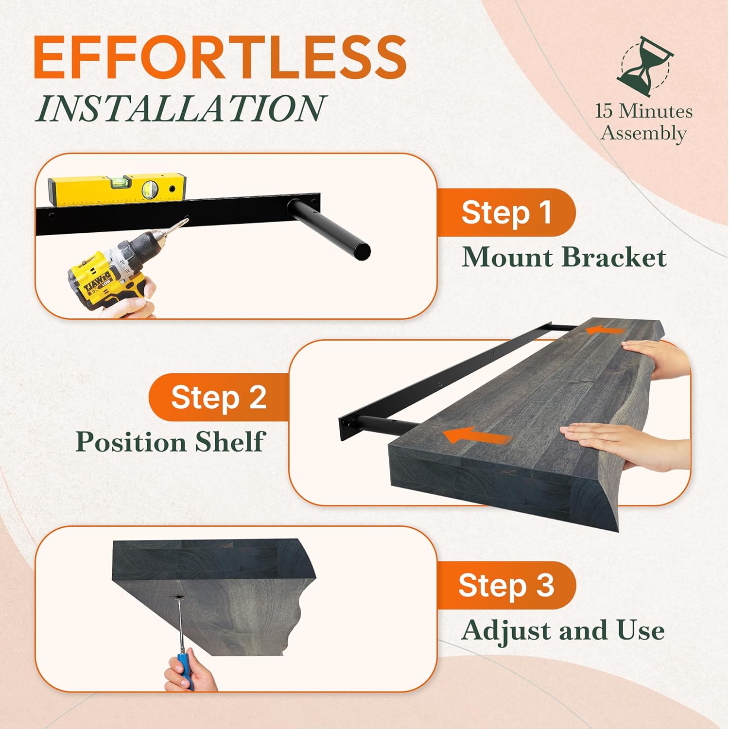- MULTIPLE USES: Elevate your space with our versatile live edge acacia wood shelf. Well-suited for various spots like entryway, vanity, desk, or between windows. These rustic floating shelves are ideal for showcasing in the bathroom, living room, or any other area, adding both style and functionality.