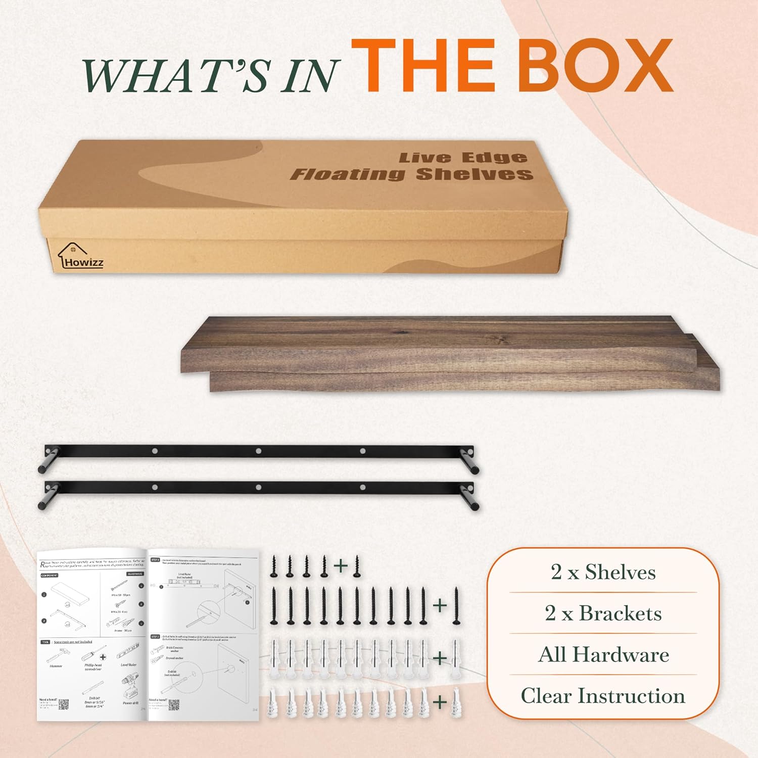 - THICK WOOD SHELF: Howizz's wall shelf is crafted from 100% acacia wood with, emphasizing its rich texture and robust durability. These live edge wood shelves will bring distinctive character to your space, offering a unique blend of vintage and modern elements.