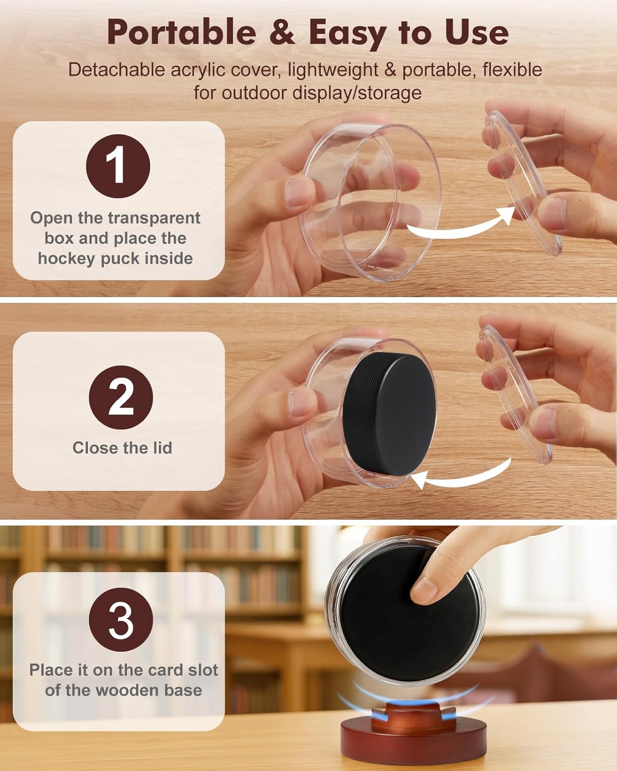 - Detachable Design for Easy Portability: The acrylic cover of the puck display case can be detached independently, and the whole is lightweight and easy to hold. It is very suitable for carrying (with a hockey puck inside) to collection exchange events, or for temporary display and short-distance transportation. It can not only protect the ball from damage but also display the collection at any time, balancing practicality and flexibility.