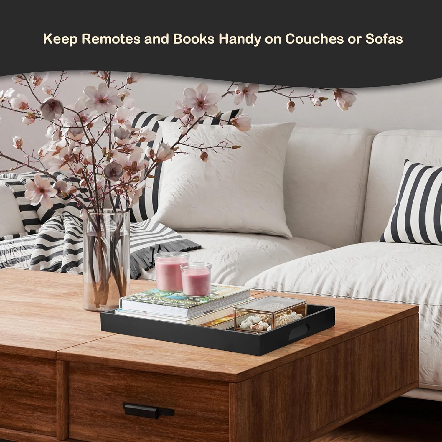 17 Inch Black Wood Serving Tray with Handles, Large Wooden Tray for Ottoman, Breakfast in Bed, Coffee Table, Dinner, Perfect for Living Room Bedroom Entryway and Kitchen
