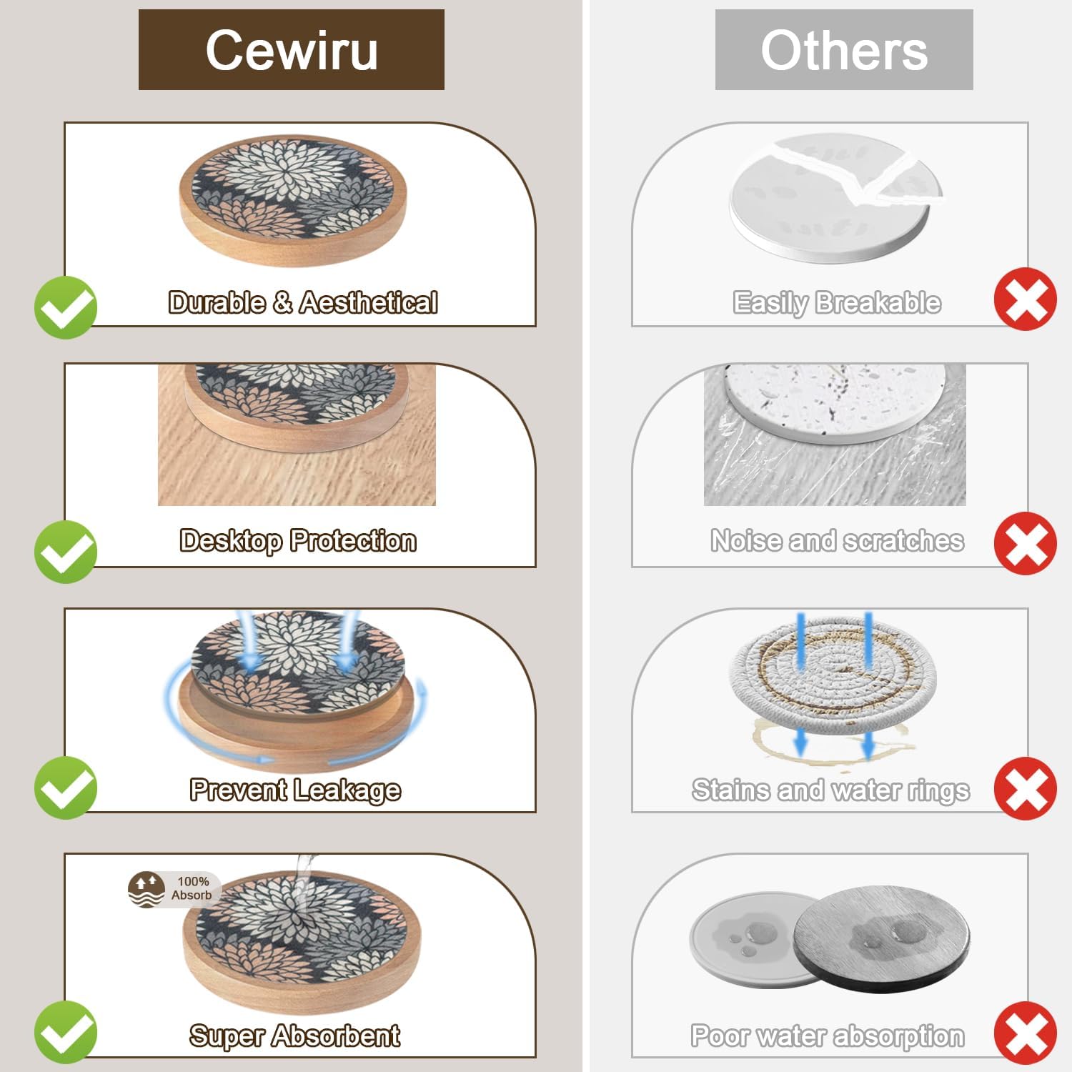 - Non-stick & Coaster with Holder: Cup coaster is thick and flat, good moisture absorption can effectively isolate adhesion forces, prevents coaster from sticking to glasses; durable & aesthetical, non-breakable, suitable for hot and cold drinks, effortlessly protects your furniture, tabletops & counter top, brings your pleasant drinking experience.