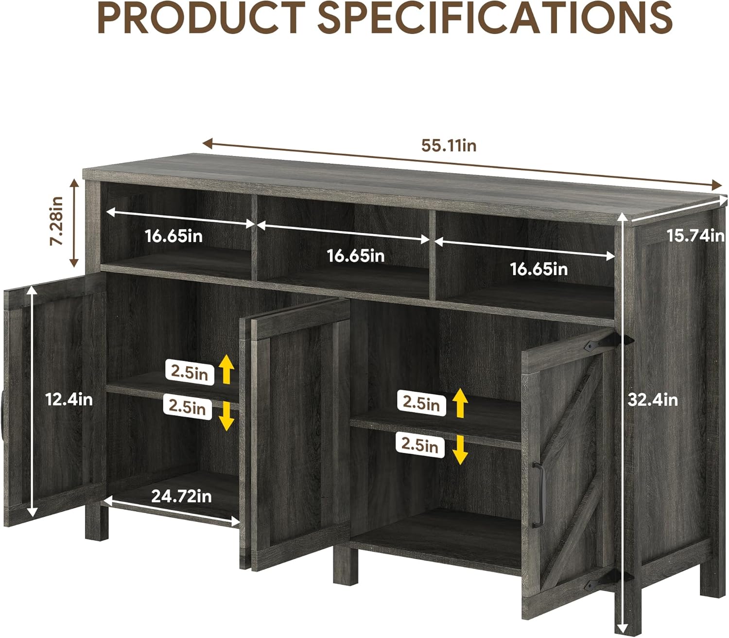 - Stylish & Elegant Design - With classic barn doors of this rustic brown buffet cabinet, adds a great farmhouse flair to your home, vintage Arrowhead Styled Hinges give the cabinets a simple and rustic appeal. Blends easily with decor style from traditional to contemporary, modern.