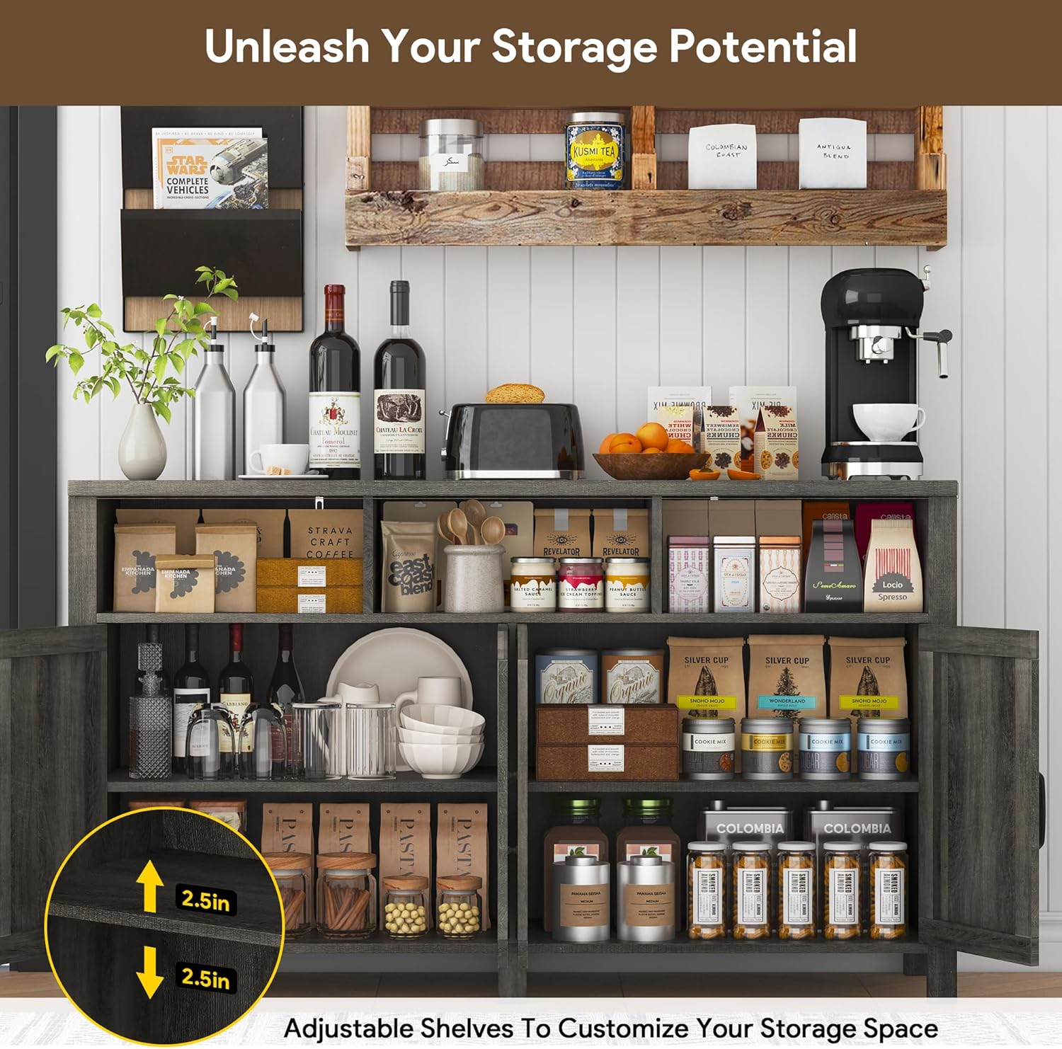 - Multi-functional Storage Cabinet - This farmhouse coffee bar accent cabinet is beautifully designed to go with any home style. It could be a coffee bar in your dining room, a storage cabinet in your entryway, a buffet sideboard cabinet in your kitchen, or even a TV stand for storing media device.