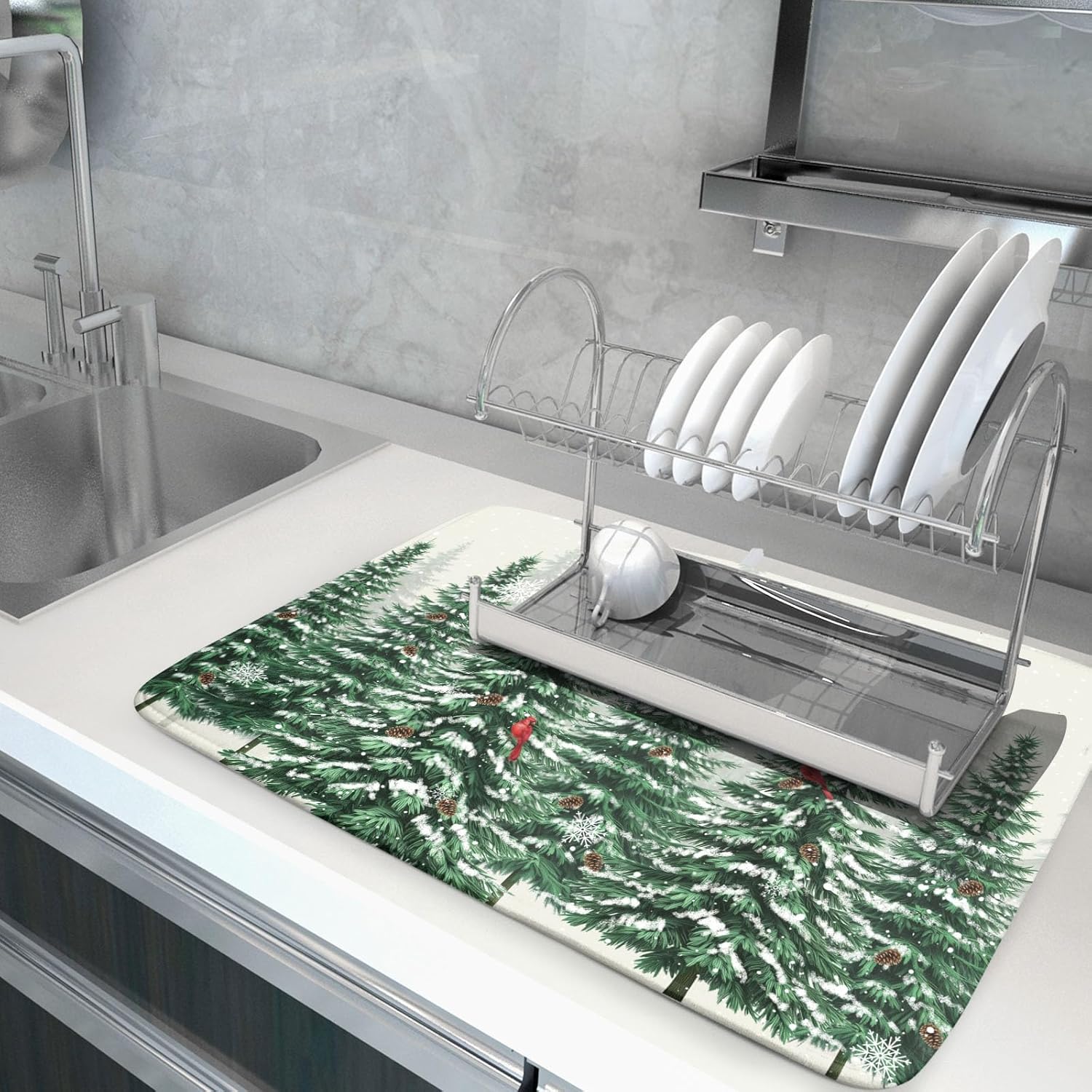 Winter Green Pine Tree Dish Drying Mat for Kitchen Counter,Red Bird Snowflake Drying Mat 18 x 24 Inch with High Absorbent Microfiber Drainer Mat for Coffee Bar