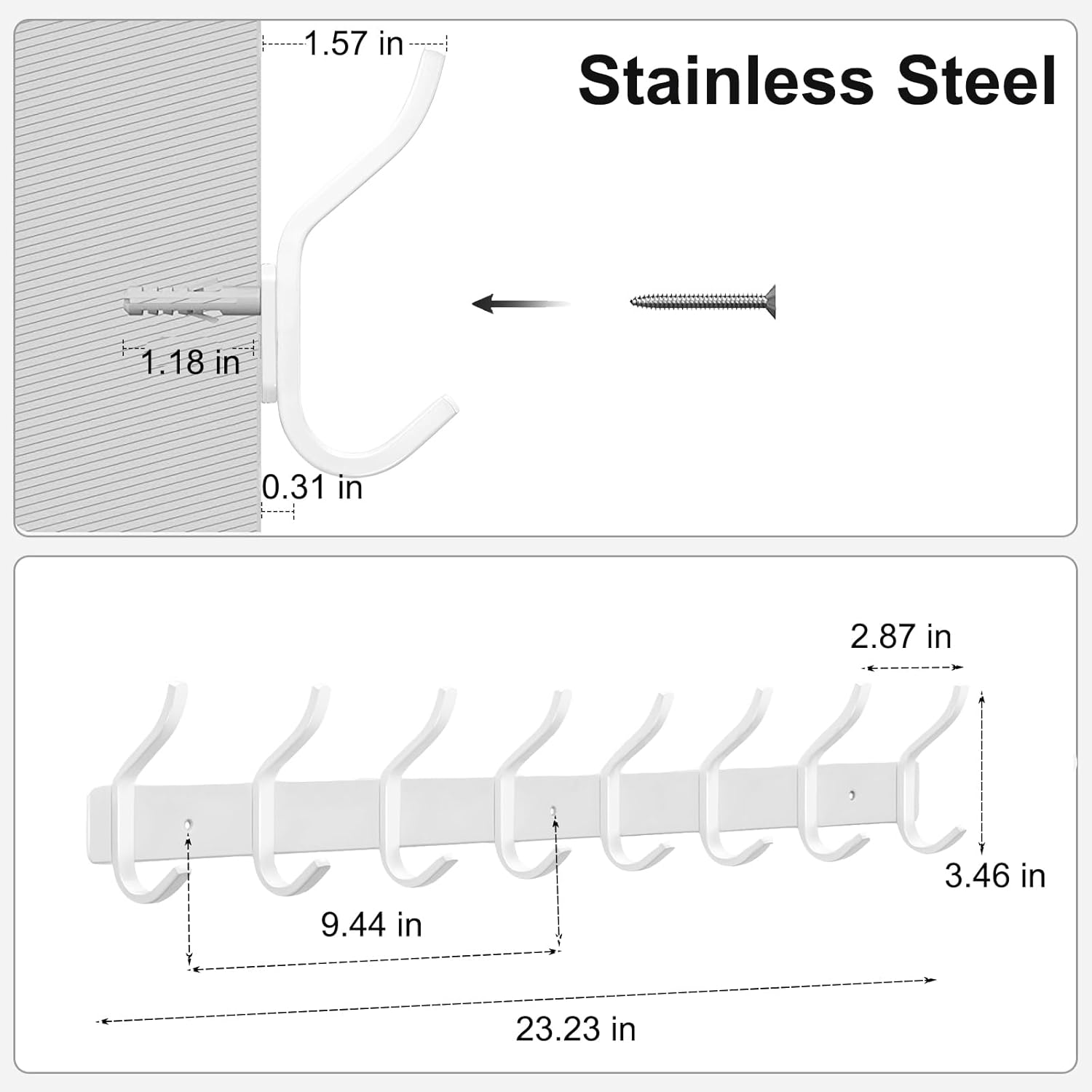 White Wall Hooks Heavy Duty, 23 Inch Coat Hooks Wall Mount with 8 Hooks,2 Packs Wall Hooks Hangers for Entryway, Bathroom - for Hanging Backpack, Bag, Coat, Purse, Hat, Towel, Clothes
