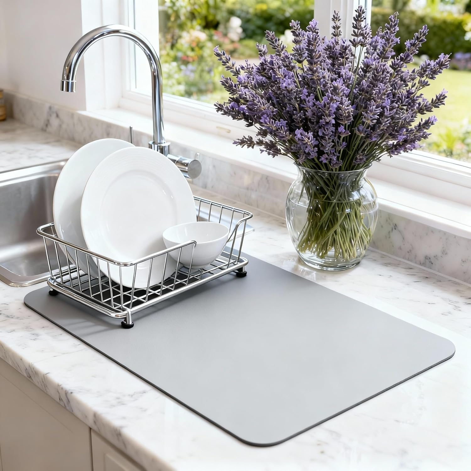 Dish Drying Mat Super Absorbent – 16" x 18" Coffee Mat for Countertops – Non-Slip Drying Mat for Kitchen Counter – Easy to Clean Water Absorbent Mat – Large Dish Drying Mats (Lite Gray)