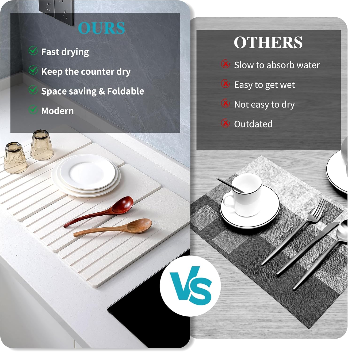 - Collapsible and Space-Saving: Measuring 23.62x15.35'' when unfolded, this collapsible stone drying mat offers ample space for your dishes. When not in use, easily store it in drawers or kitchen cabinets, maximizing your kitchen's organization