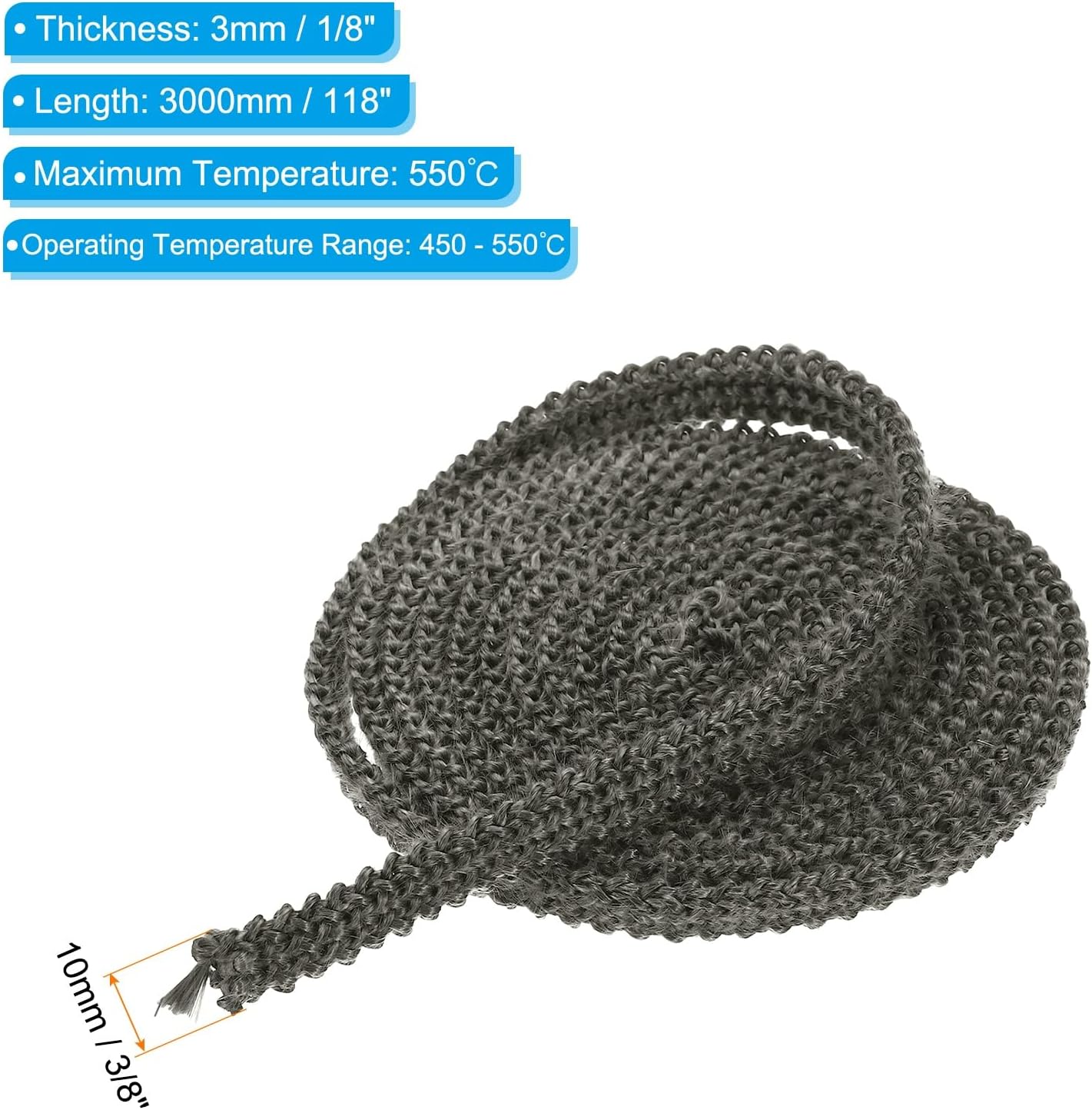 - Color: Black; Material: Graphite Fiberglass; Total Size: 10 x 3 x 3000mm / 3/8" x 1/8" x 118" (W*T*L); Maximum Temperature: 550℃; Operating Temperature Range: 450 - 550℃; Packing List: 2 x Wood Stove Gasket